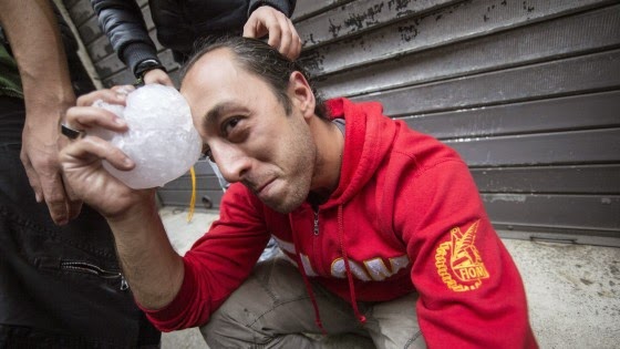 Ma il clou del surrealismo deve ancora arrivare, e se ne occupa proprio il segretario della FIOM, Landini. Da un lato urla e sbraita, inseguito dai cronisti; ce l'ha con Renzi, col governo, con la Leopolda (fossi il povero granduca di Toscana, mi rigirerei nella tomba...), ogni tre parole una è cazzo; si viene a sapere che, forse, un paio di manganellate le ha prese pure lui (e sarebbe ora: che le devon prendere sempre e solo gli operai?), eppure sentite cosa fa, en resumidas cuentas, il Landini. Si adopera per fermarli, gli operai che stavano cominciando a cercare di rispondere in qualche modo alle cariche dei padri di famiglia che avevano di fronte. Prosegue la diretta tv e Landini prende il megafono rivolgendosi non solo agli operai: anche ai poliziotti.